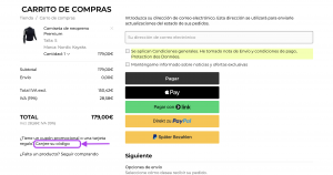 El código de descuento se puede introducir en el carrito de compras, debajo de la lista de productos, antes de finalizar la compra.